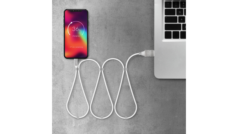 Datorita magnetilor, cablul poate fi stocat in orice forma, fara a se incurca.